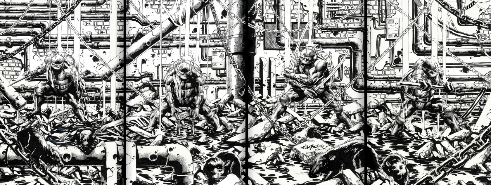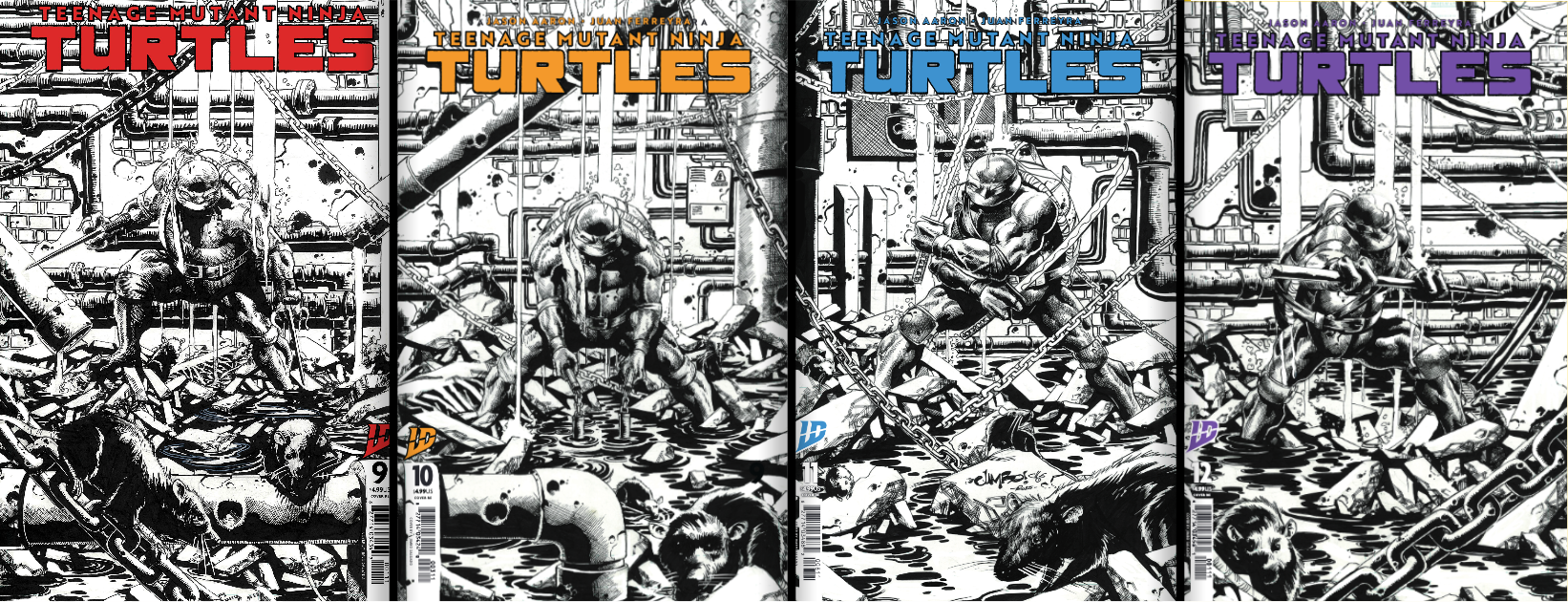 Bringing our biggest TMNT exclusive drop yet — Jimbo Salgado delivers a stunning 4-issue connecting cover set for Teenage Mutant Ninja Turtles #9–12! Each cover spotlights a different Turtle, set deep in the grimy sewers of New York, rendered in a gritty black-and-white style as a tribute to the original TMNT run!